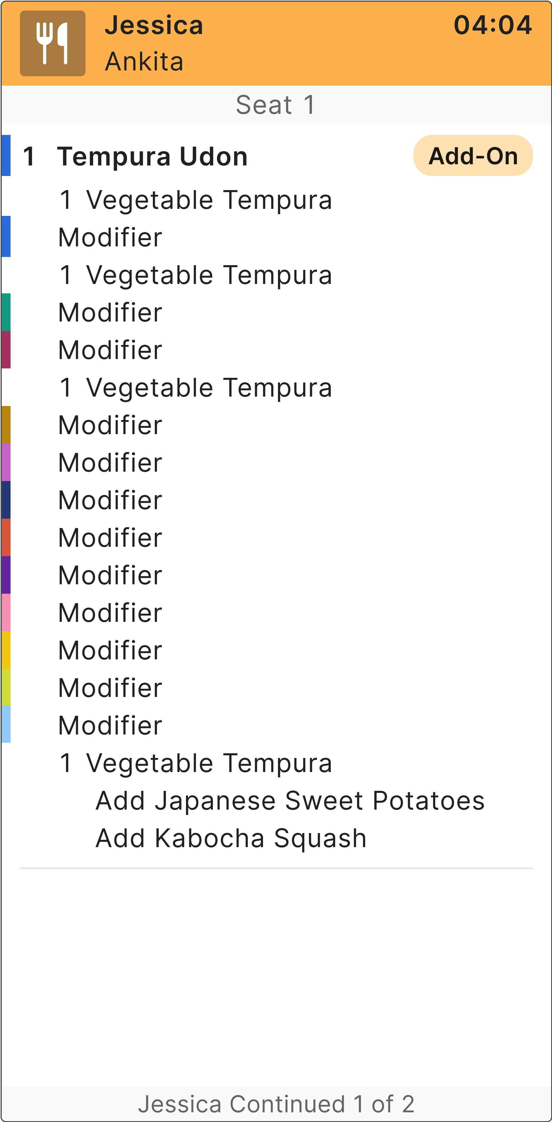 After the ticket layouts were redesigned a couple years ago, the feedback we received from many customers was that they wish they had the ability to highlight modified menu items in order to make them visually attractive and therefore not easily missed as orders were being made. As you can see below, the basic ticket layout has three colors: red (threshold time exceeded), orange (threshold time approaching), grey (no threshold time triggered). In addition add-ons, voided items and “no” item colors are sprinkled throughout the ticket with similar error and warning colors. We knew that having these types of modifiers would not be common, and therefore made sense to reuse these colors to signify the more “negative” actions.